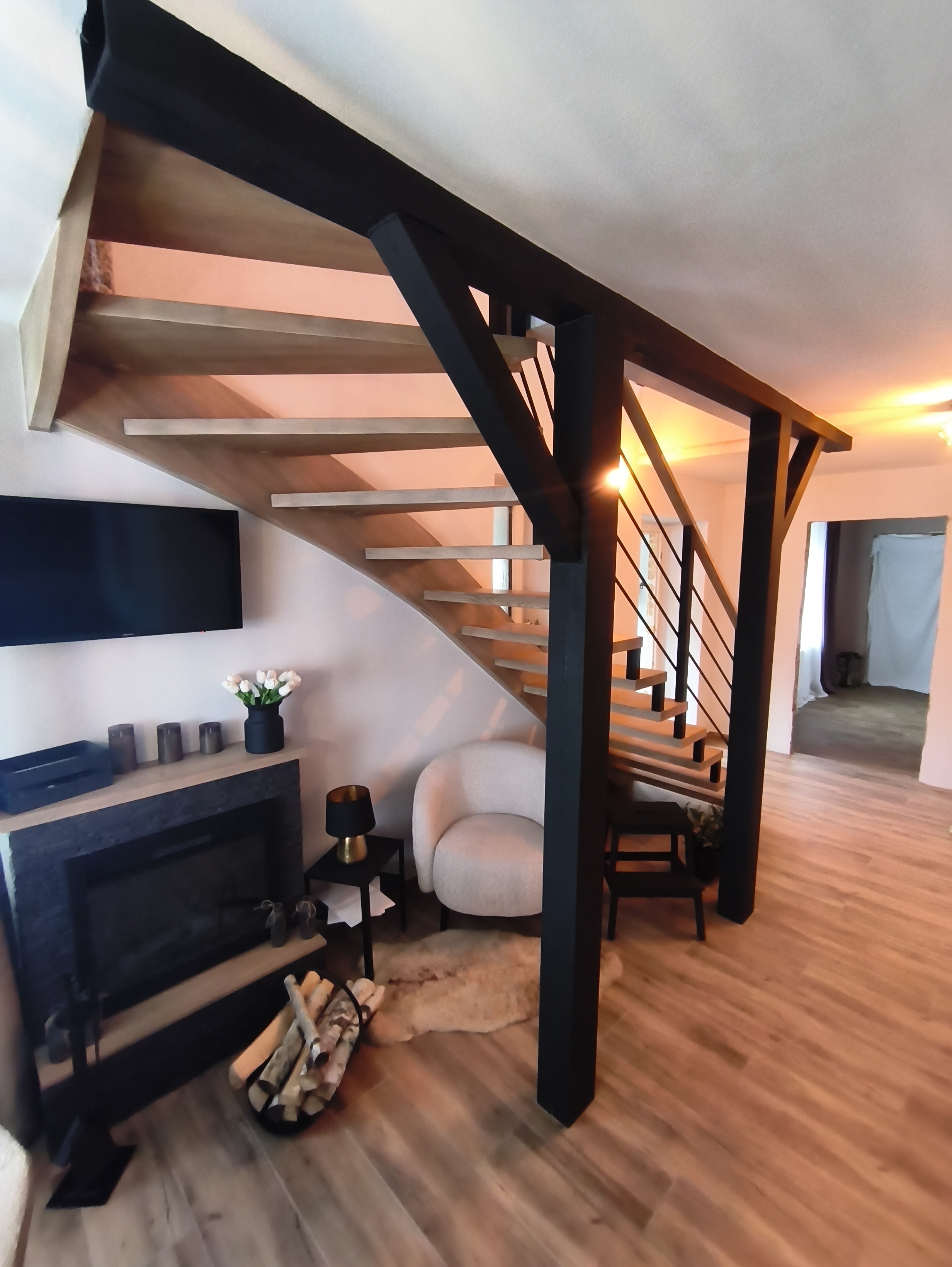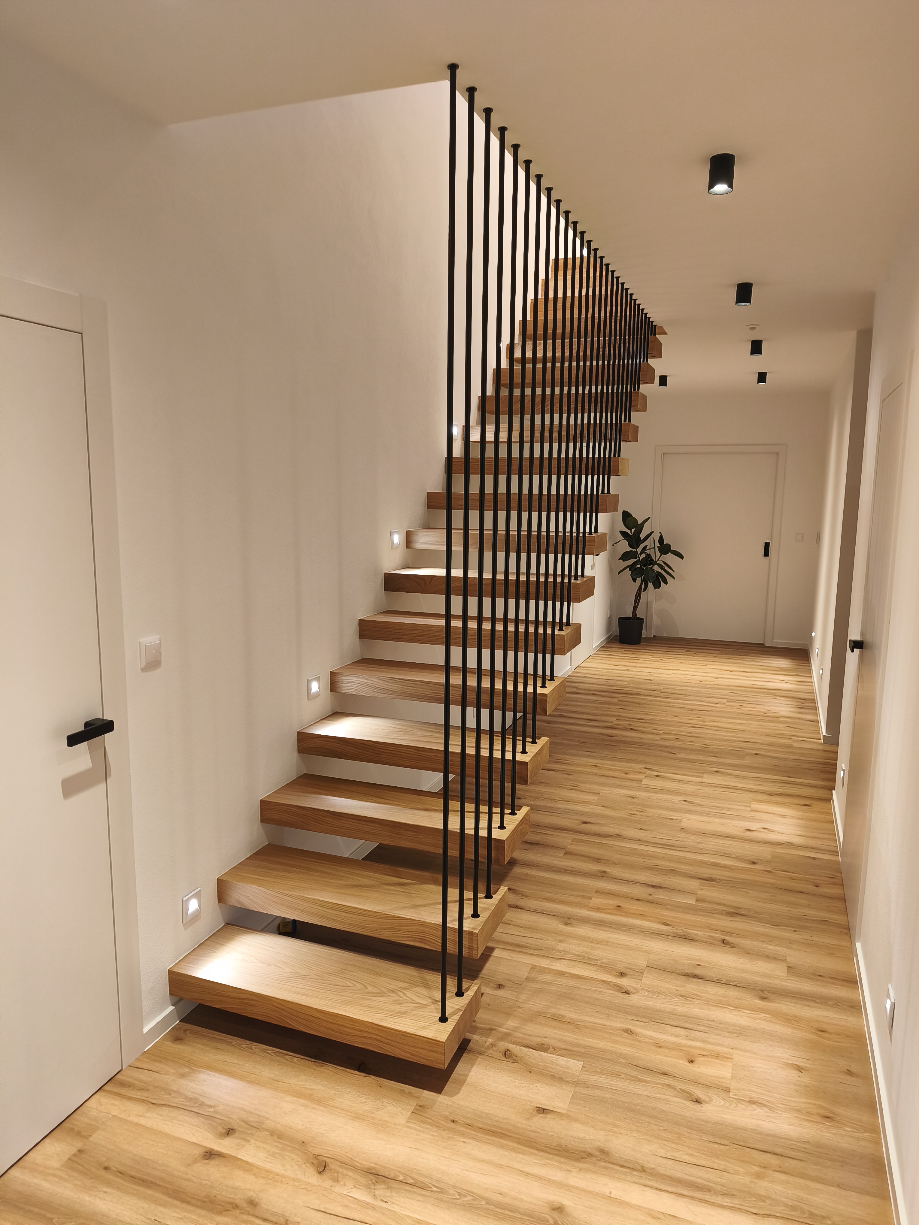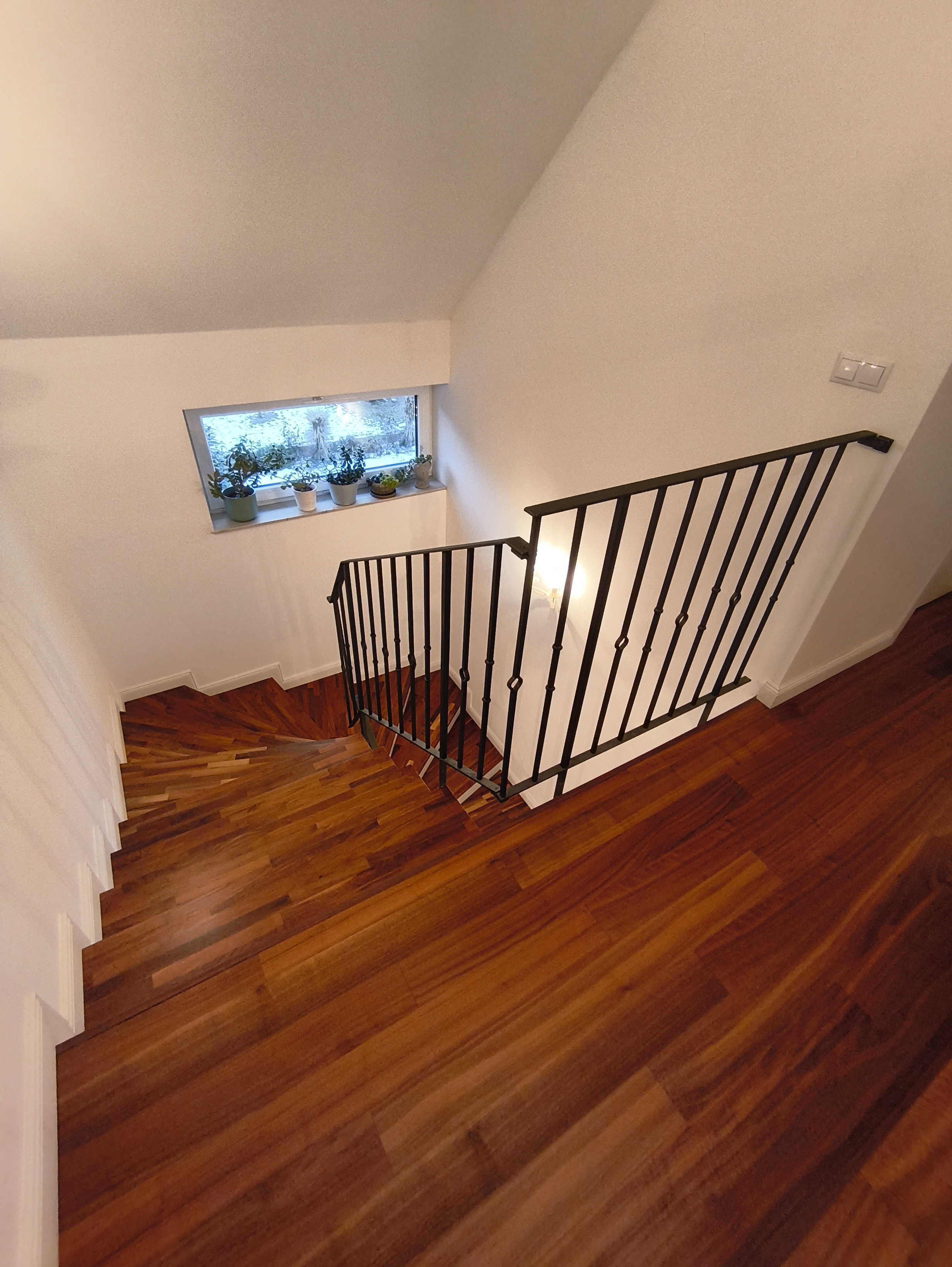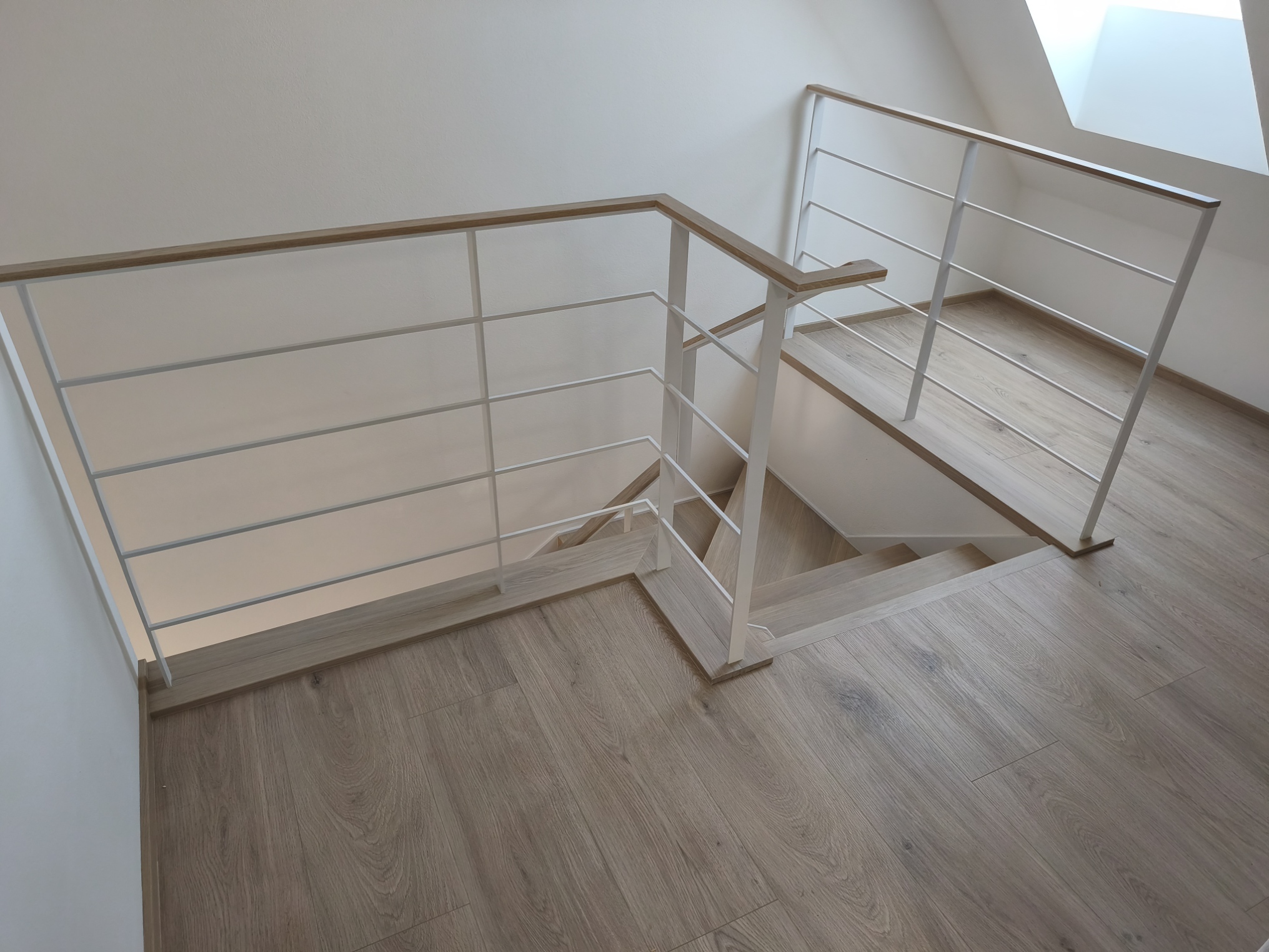 Schodiště s dřevěnými stupni a kovovými prvky působí industriálně, ale stále si zachovává příjemný charakter díky přirozenosti dřeva. Kovové zábradlí může být buď jednoduché a minimalistické, nebo s výraznějšími detaily, podle přání zákazníka a stylu interiéru. Výsledkem je originální a funkční řešení, které v sobě spojuje sílu kovu a přírodní krásu dřeva - ideální pro svou univerzálnost použití pro moderní byty, starší usedlosti i komerční prostory.
