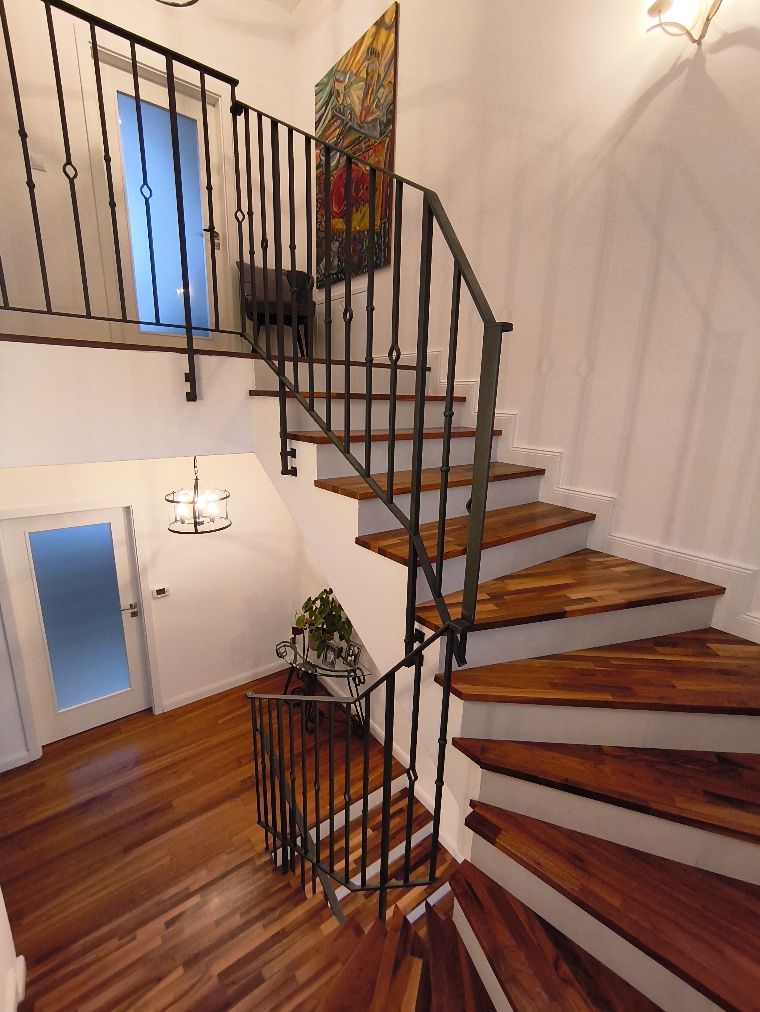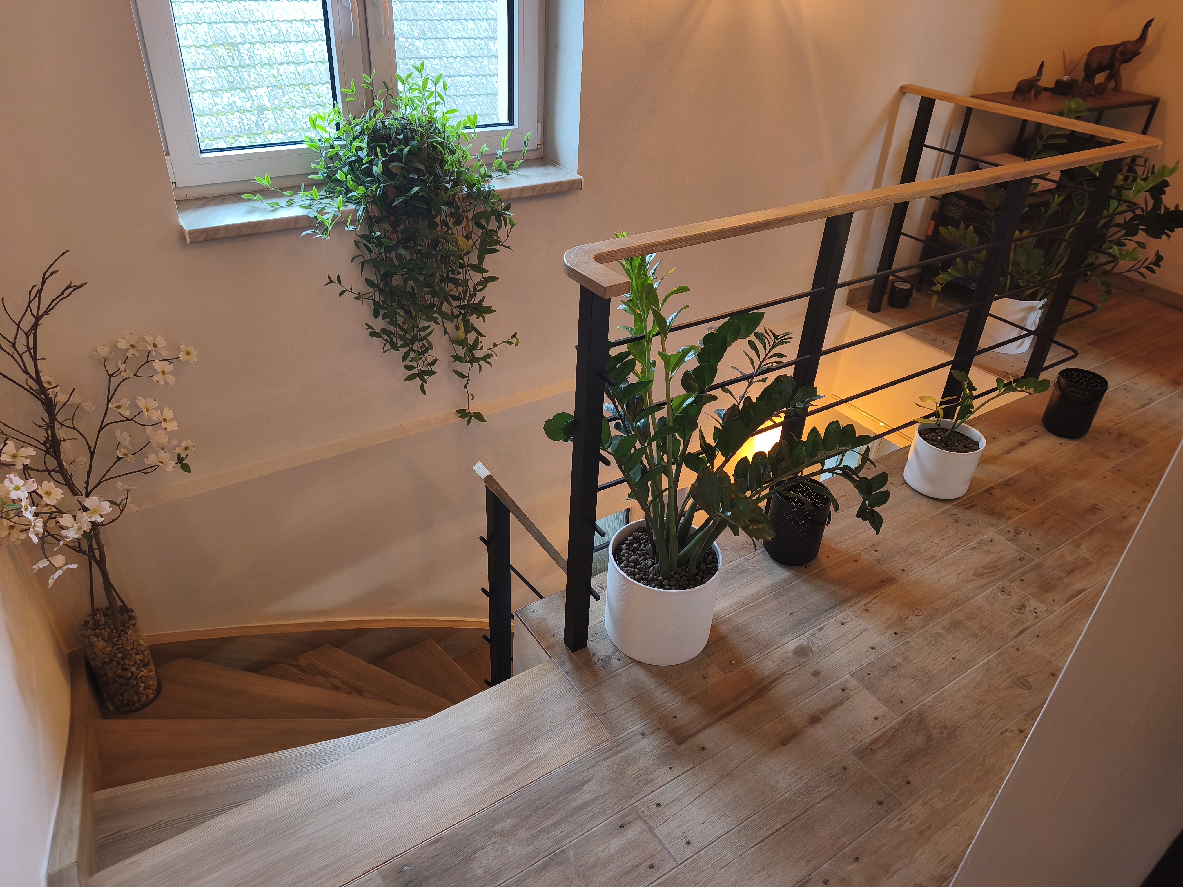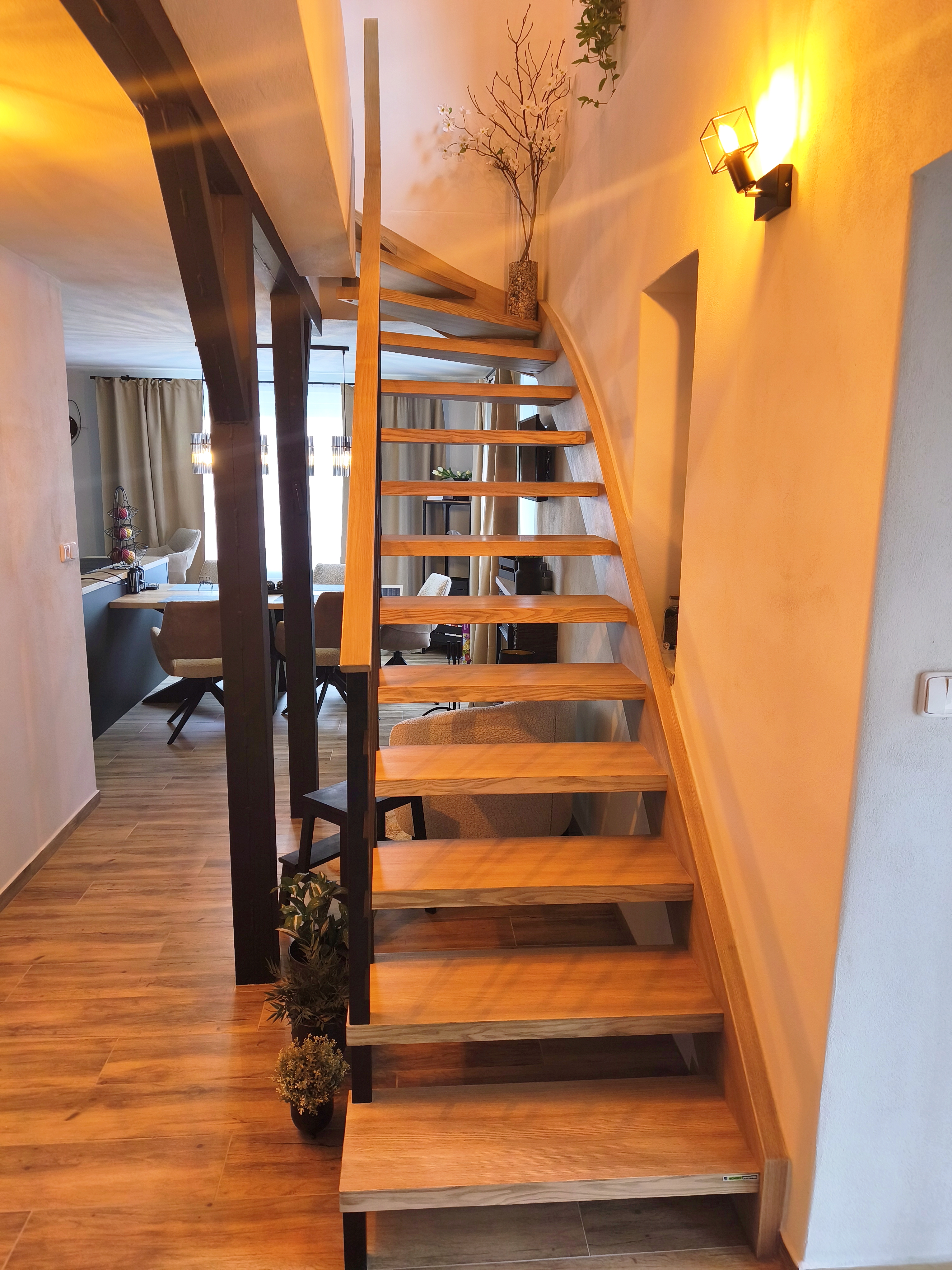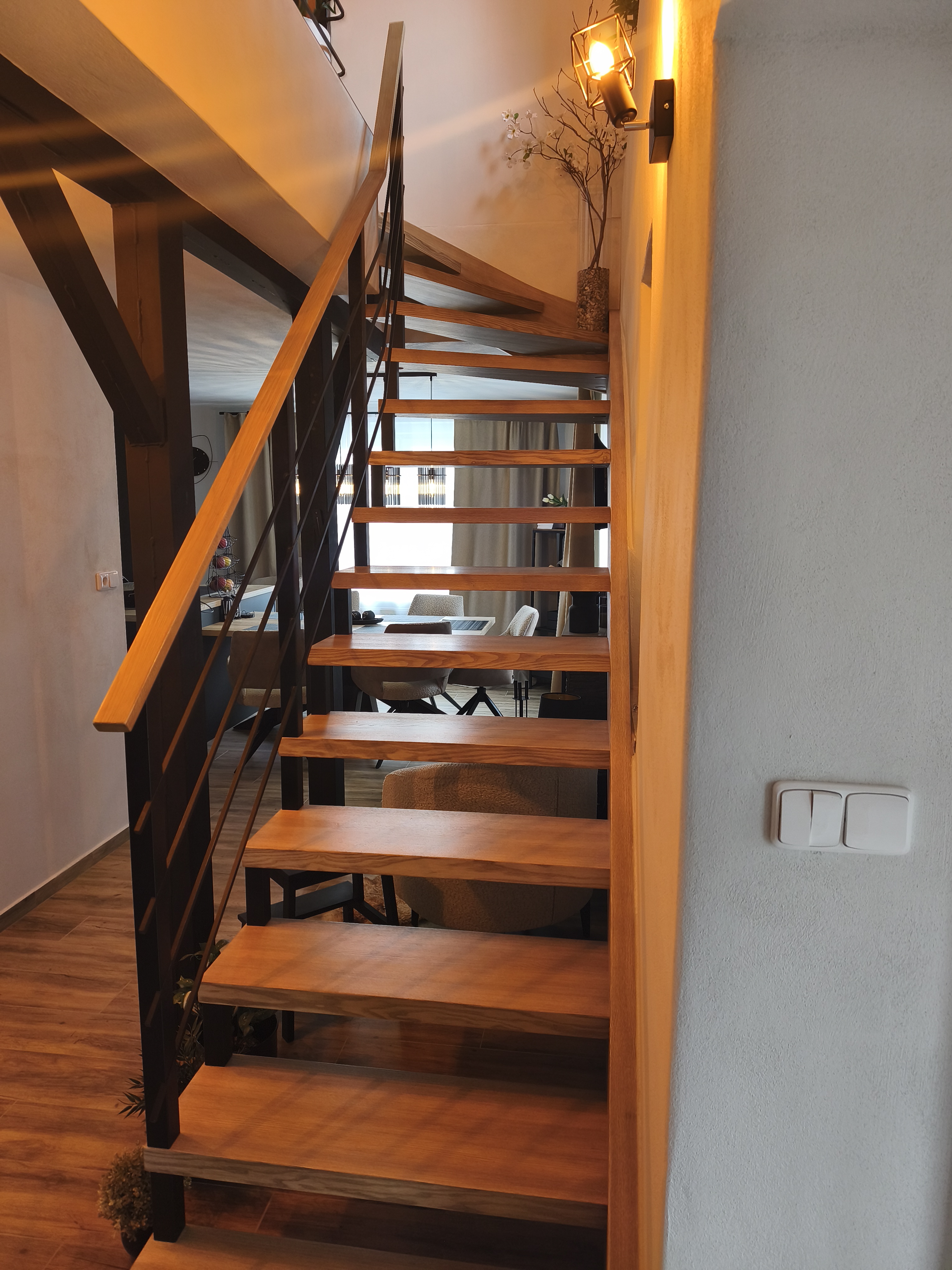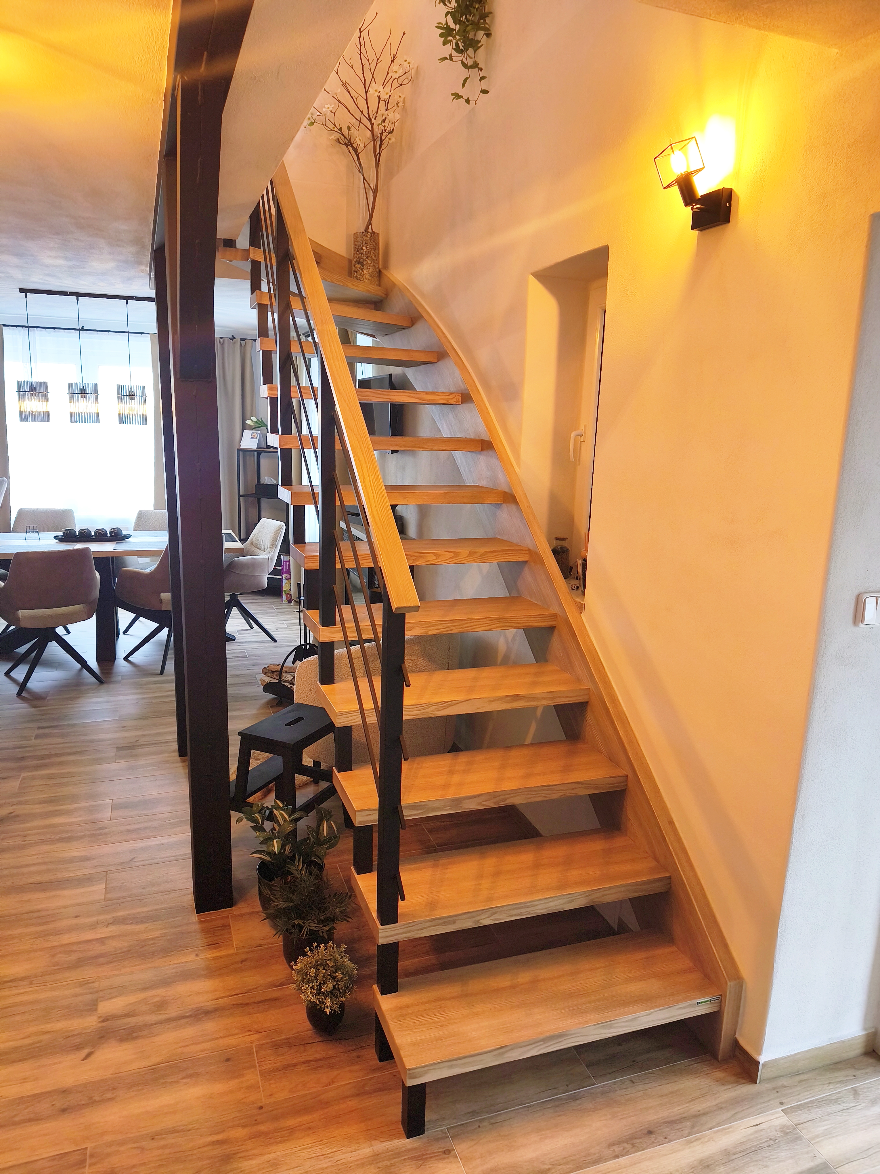 Schodiště s dřevěnými stupni a kovovými prvky působí industriálně, ale stále si zachovává příjemný charakter díky přirozenosti dřeva. Kovové zábradlí může být buď jednoduché a minimalistické, nebo s výraznějšími detaily, podle přání zákazníka a stylu interiéru. Výsledkem je originální a funkční řešení, které v sobě spojuje sílu kovu a přírodní krásu dřeva - ideální pro svou univerzálnost použití pro moderní byty, starší usedlosti i komerční prostory.