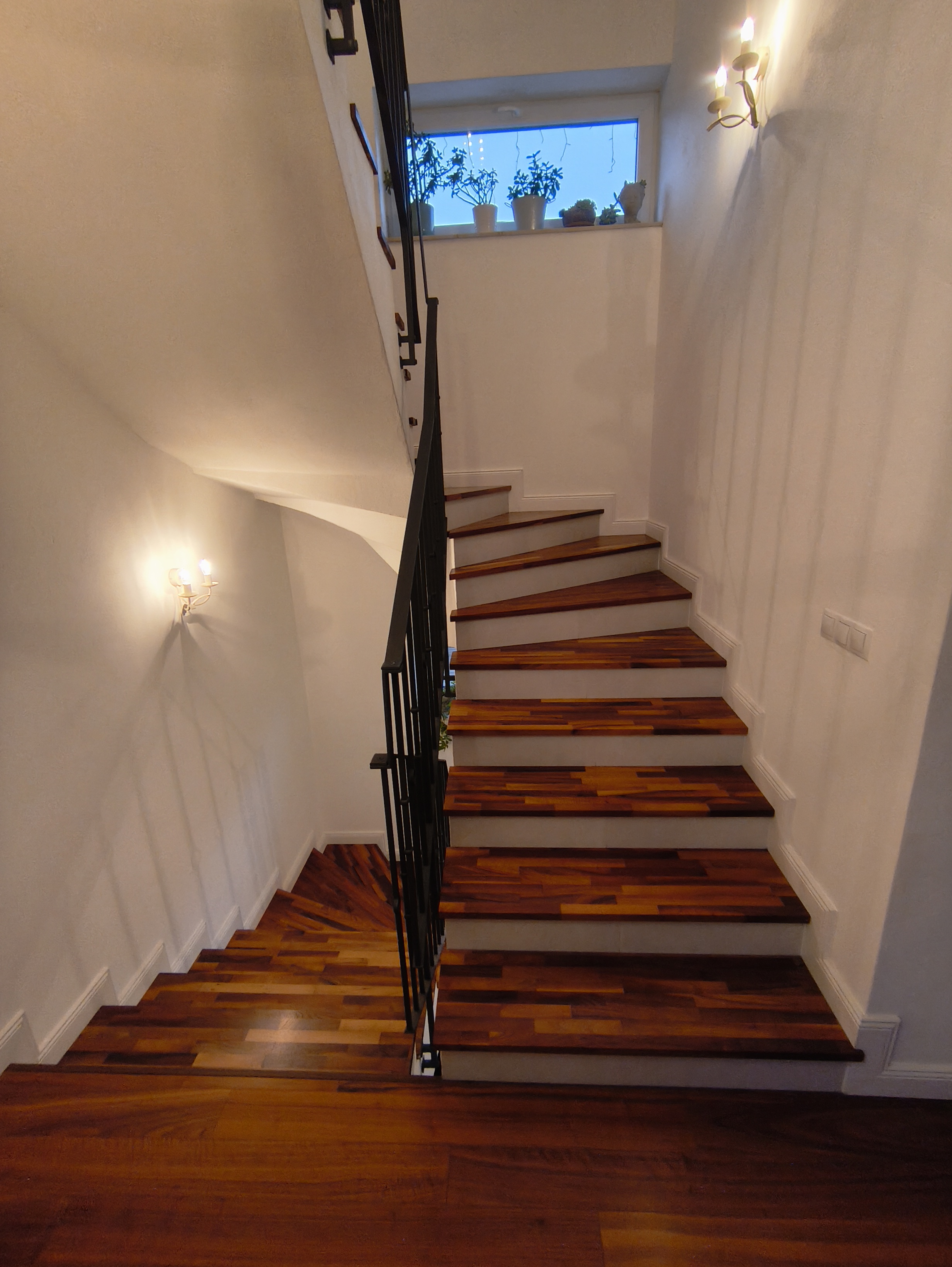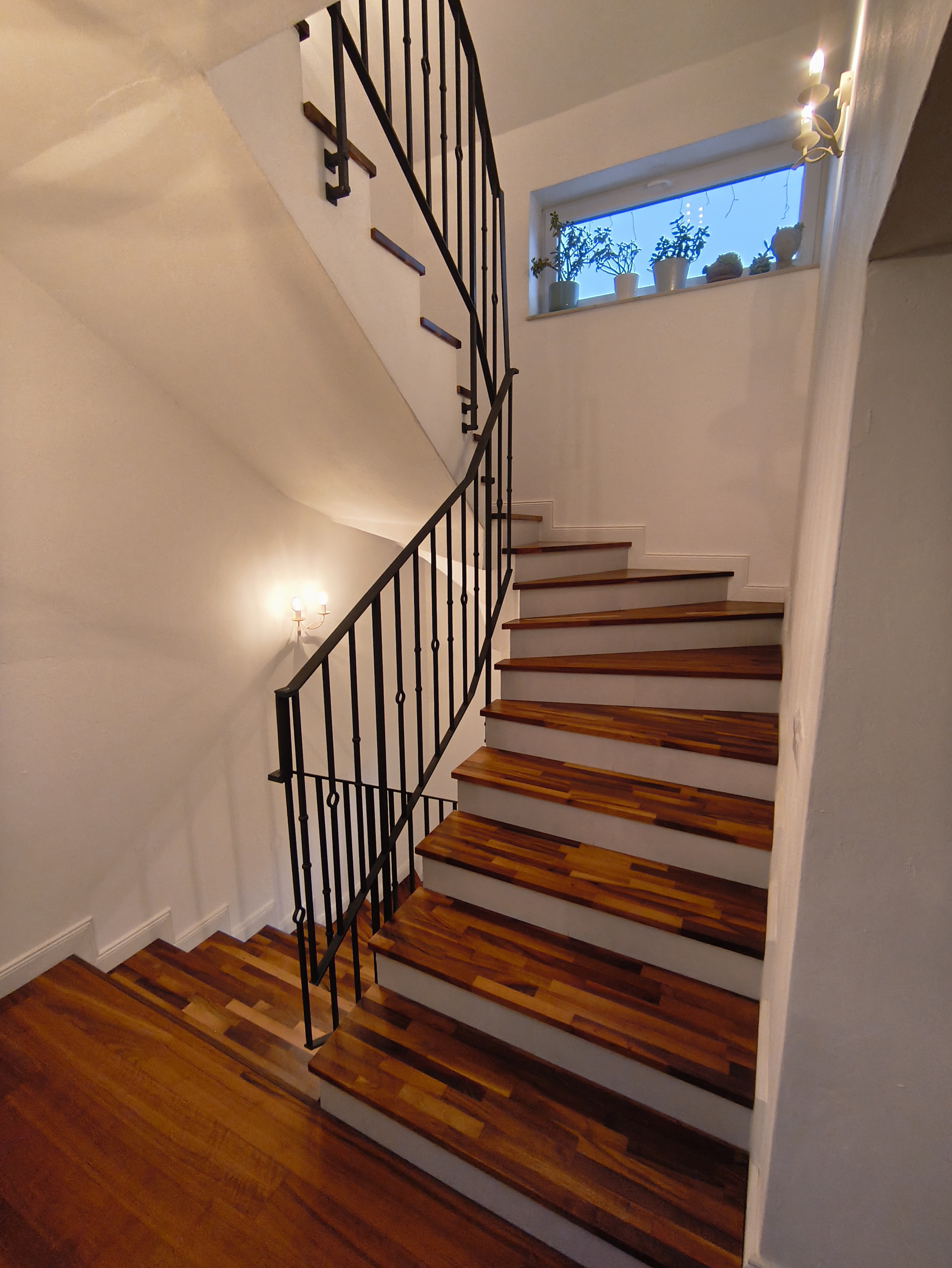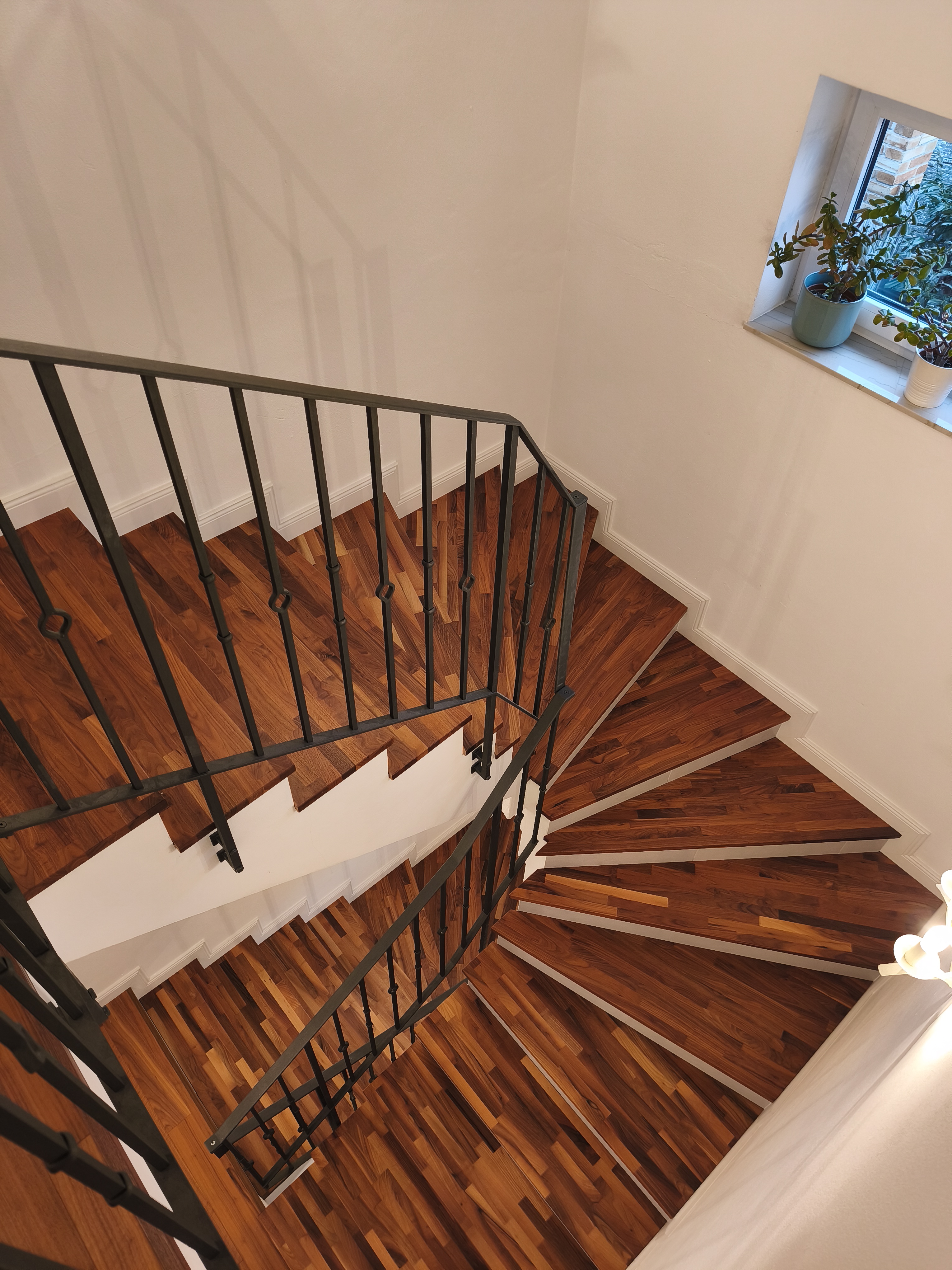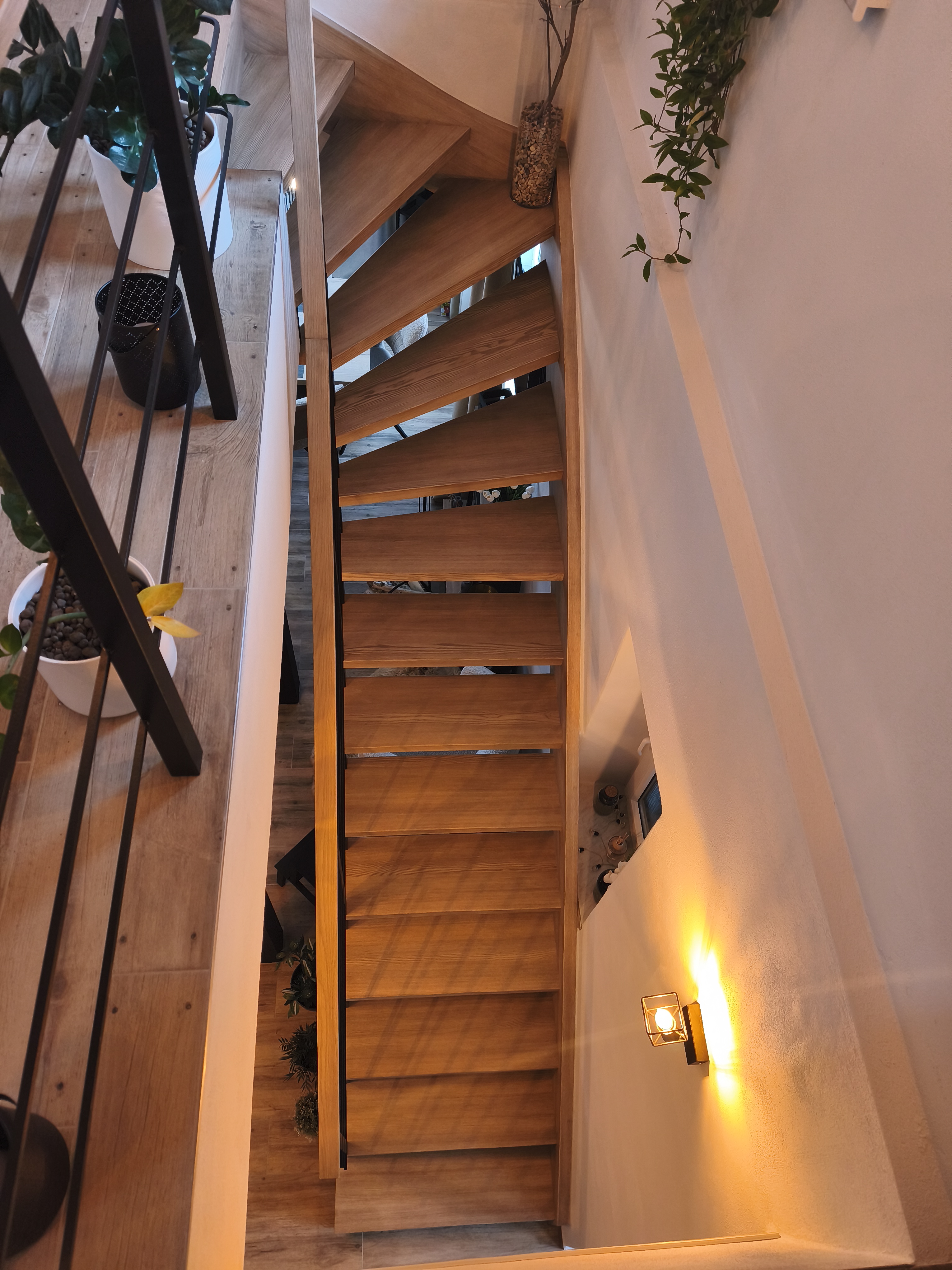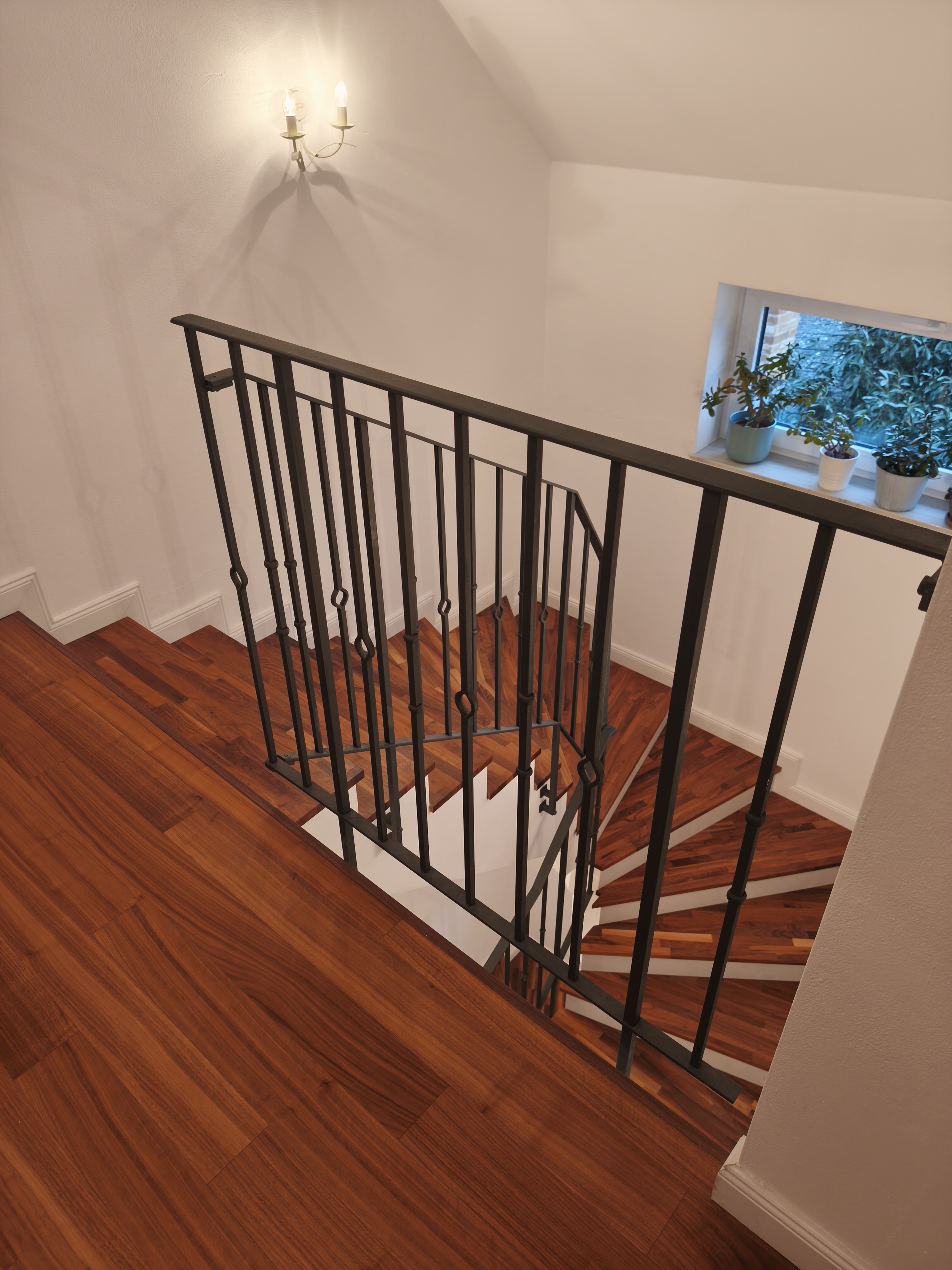 Schodiště s dřevěnými stupni a kovovými prvky působí industriálně, ale stále si zachovává příjemný charakter díky přirozenosti dřeva. Kovové zábradlí může být buď jednoduché a minimalistické, nebo s výraznějšími detaily, podle přání zákazníka a stylu interiéru. Výsledkem je originální a funkční řešení, které v sobě spojuje sílu kovu a přírodní krásu dřeva - ideální pro svou univerzálnost použití pro moderní byty, starší usedlosti i komerční prostory.